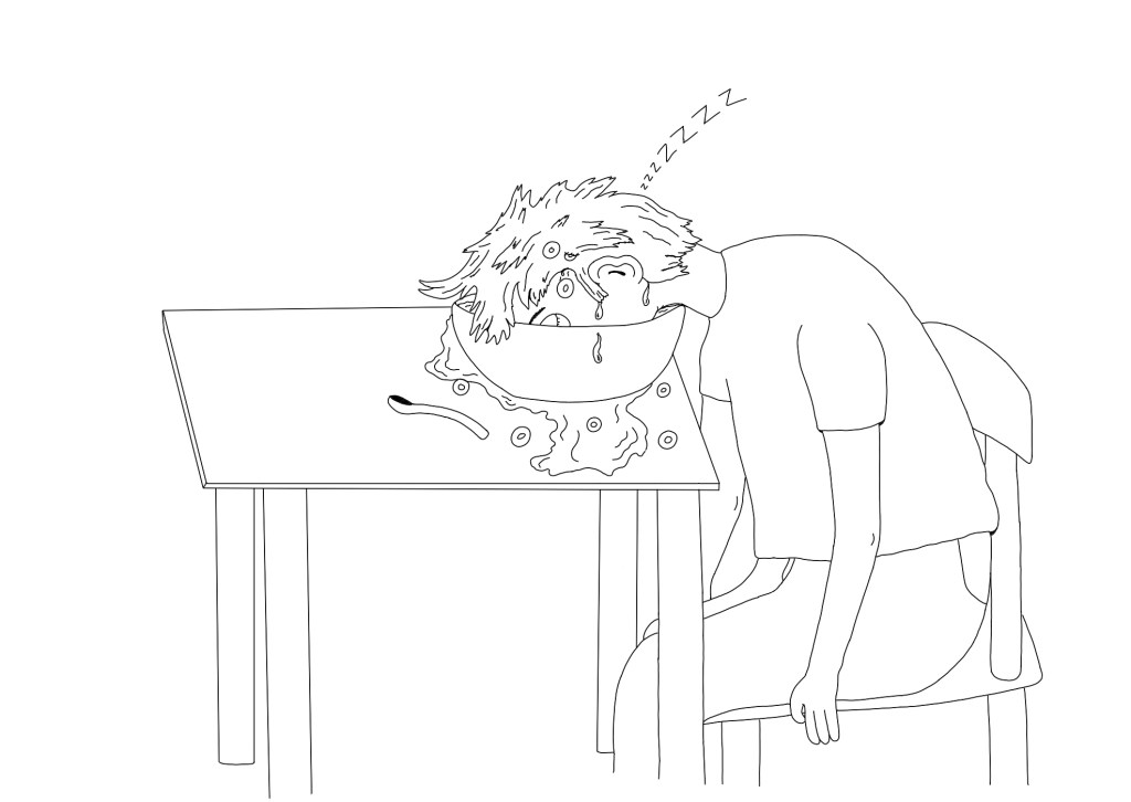 He's fallen asleep in the cereal bowl.