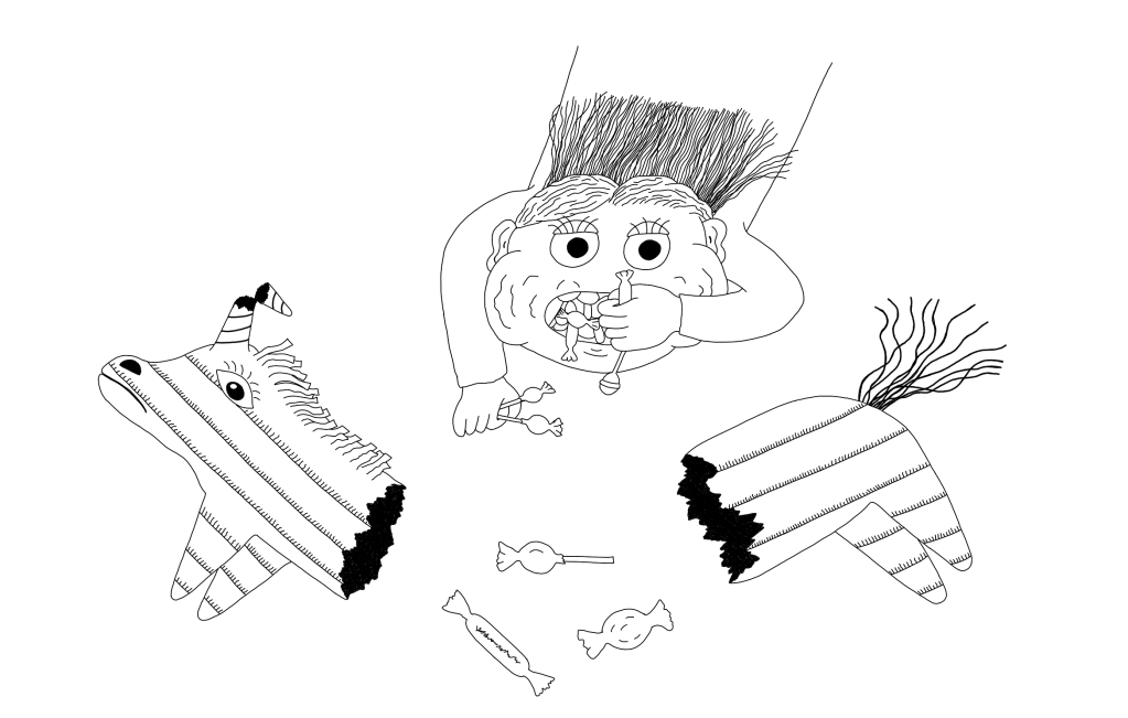 This is a poem about a pony. A pony with a dream of entertaining children at a lovely outside party, the first she’d been invited to in fact. But those dreams were smashed, along with the pony’s cardboard body when she learned what kind of party it really was. Traditions can be strange if you think about them. Why do we hit a colorful animal with a stick and then gather its sugary entrails into bags? Who started this violent party pasttime? I don’t know, but I totally get the appeal. I’m a huge fan of a TV show called Mythbusters. I’ve written about this show in other poem posts. The Mythbusters tested science related myths in spectacular ways. The best part about the show was when they would spend days, weeks even, building an elaborate setup of mannequins, pianos, cars, an entire house, or all the above, only to then blow it to smithereens with guns or explosives. There’s something very satisfying about making a giant mess out of something like a pinata, or if you have the resources, an entire car when you know you won’t get into trouble for it. Pinatas fill that destructive need in kids, and then rewards them with treats for doing it. I think adults should do pinatas more often to get out their agressions. I can imagine a gauntlet of pinatas shaped like mini-vans, houses, flat screen TVs, and laptops with a bunch of crazed adults running through them swinging mop handles and large kitchen utensils. The pinatas would be filled with buy-one-get-one coupons, grocery items, free oil changes, and $20 bills. Sounds much better than the boring parties we adults do where we sit at the table and politely eat finger foods and talk about the weather. Kids would enjoy watching the adults go nuts with sticks and fighting over coupons even more than adults like watching them fight over candy. Of course, the adult version of the pinata wouldn’t be nearly as fun for the poor sap who had to fill it with all that expensive stuff. Well, I’m off to plan my wife’s birthday party. Have a good night.