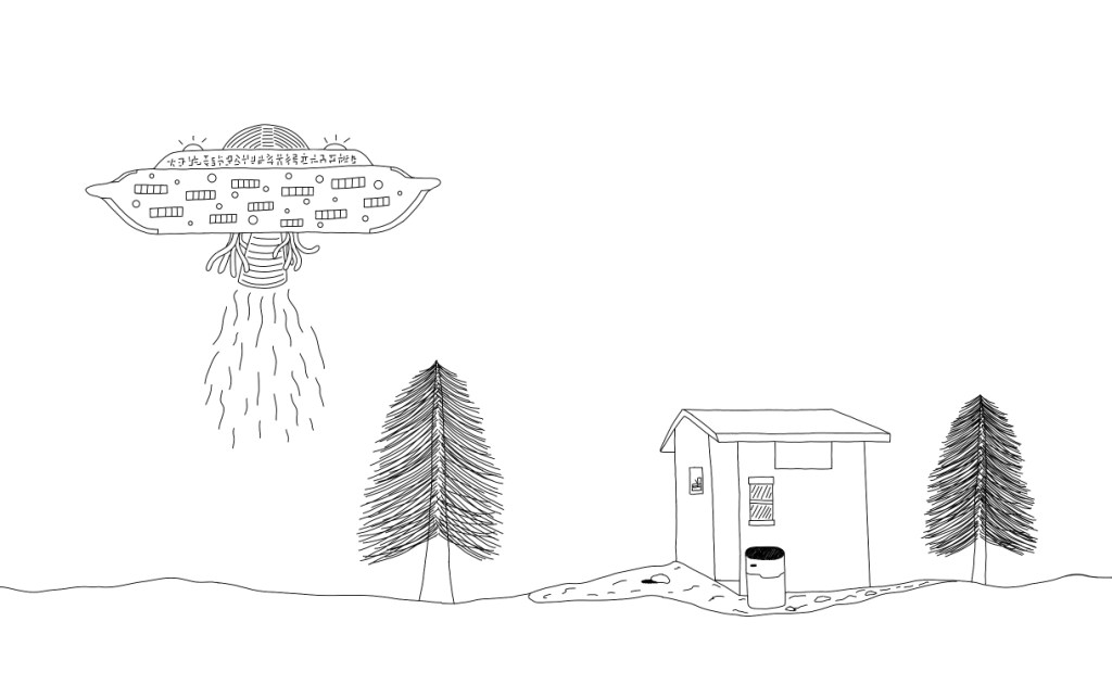 Sometime ago in the woods I was hiking, When out of the clouds came a flash like lightning. I looked to the sky and my eyes were astounded - a saucer ship hovering, blue light surrounded! It zipped and it spun like a big shiny bee. It finally stopped, hovered right next to me. My jaw hung wide open. I couldn't believe. A craft that no human could ever conceive. It landed so softly, a smooth gentle glide. A feeling of awe crowded up my inside. At the top of the ship, strange gasses were stirring. Then the door lifted open with clicking and whirring. I wanted to speak but my tongue became granite. How to greet beings from some other planet? A many-legged beast down a ramp came squishing. For all the right words I just kept on wishing. The thing raised a tentacle, ready to speak. I held in my breath as the alien squeaked, "Hey, where is your bathroom? I have to pee." My shaky hand pointed to a shack in the trees. I guess the weird bugger just needed a restroom. The space creature entered. I heard a loud BOOM! When it's business was finished it simply said, "Bye", got back in its ship and shot up through the sky. The rude little creature was in such a rush, didn't stop to meet humans, and forgot to flush. -B.C. Byron